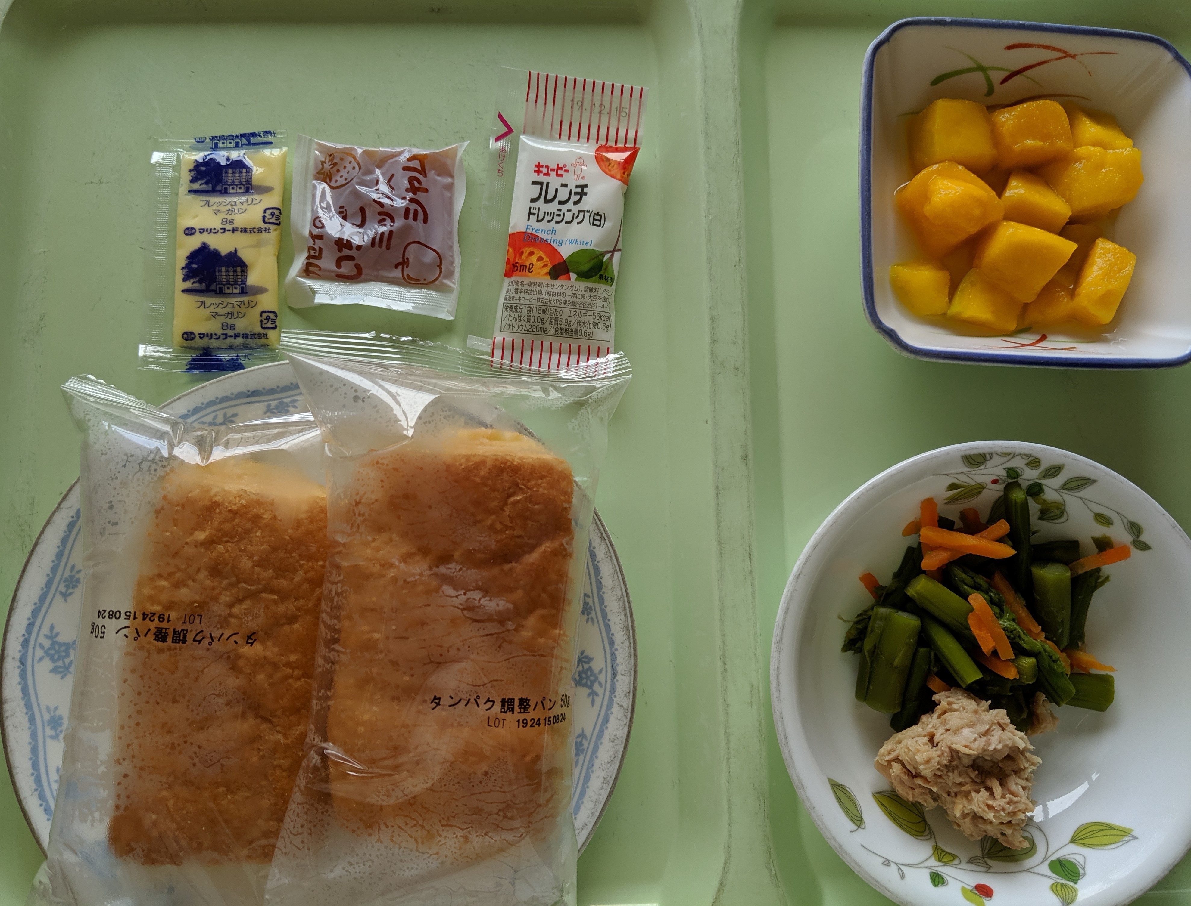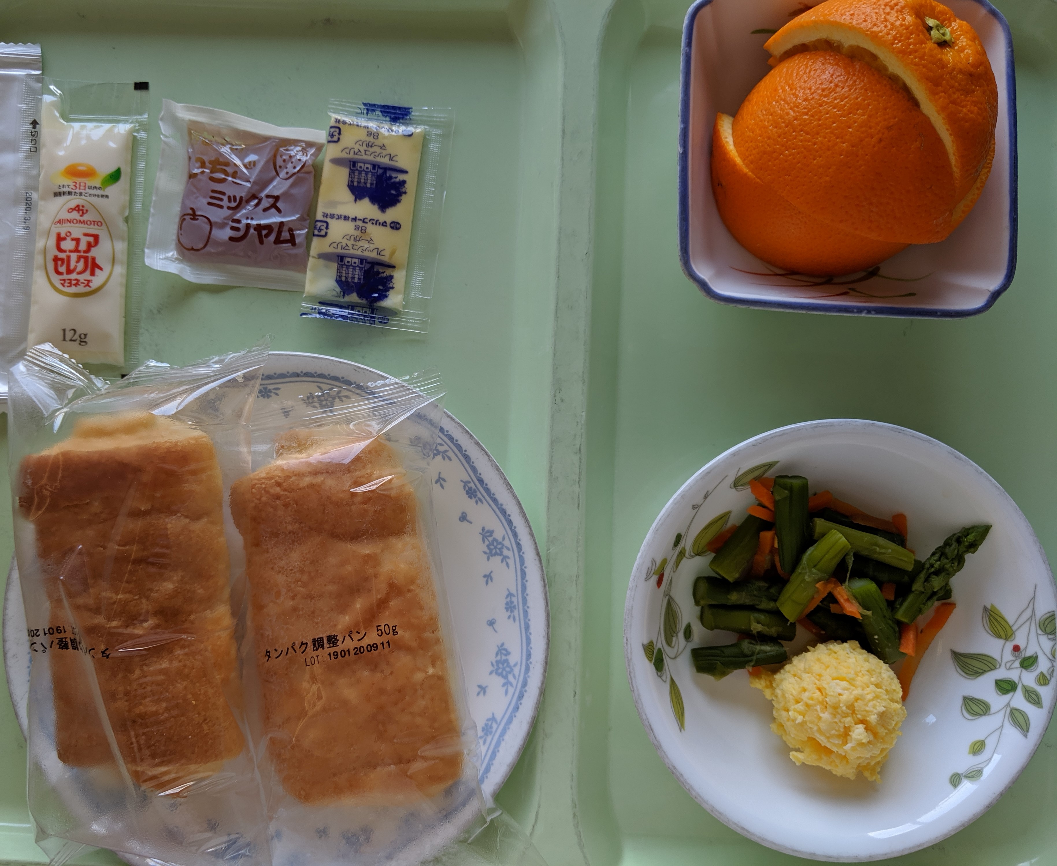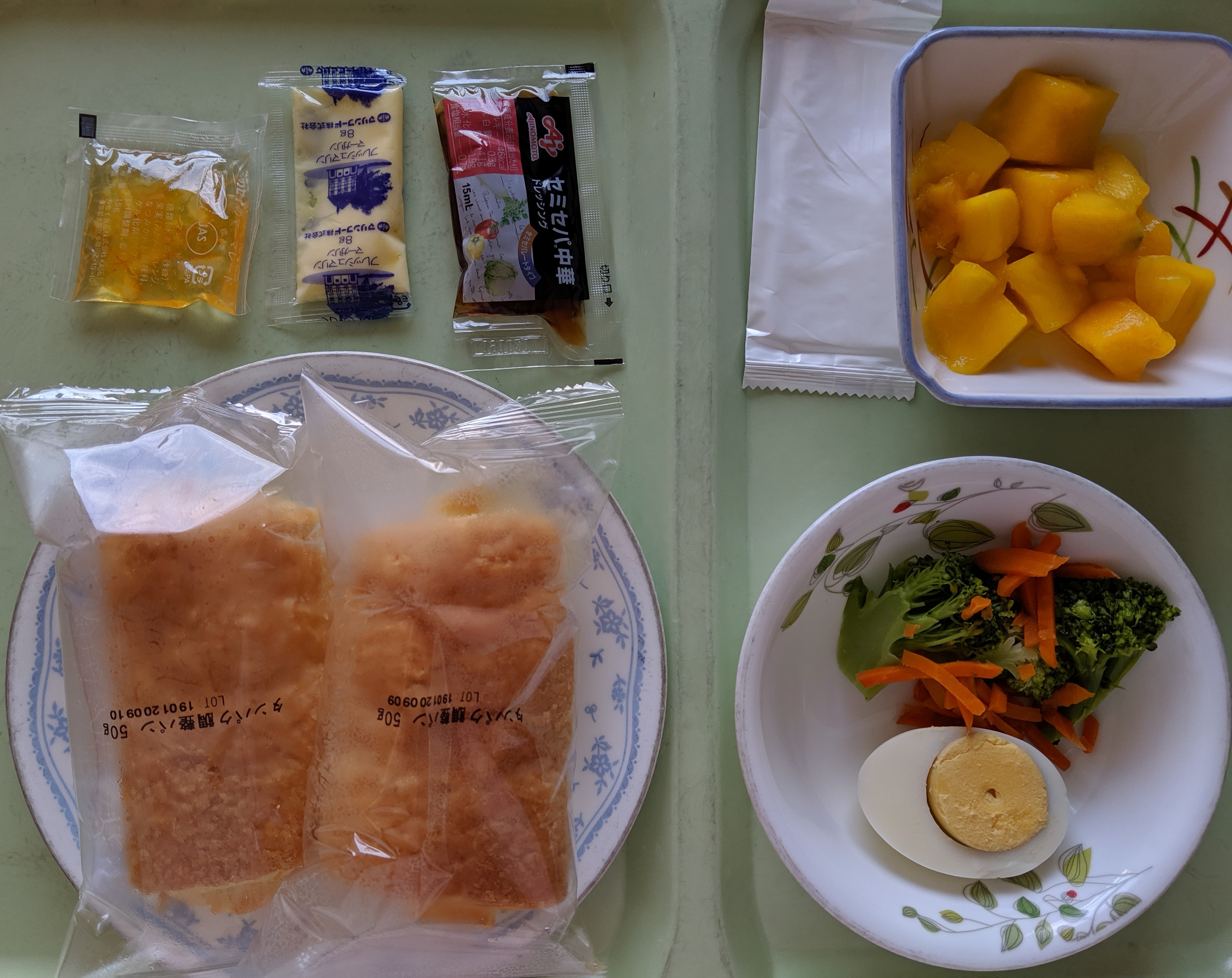 病院では パン2個とちょっとサラダとくだものが定番でした。